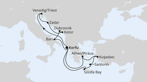An der Grenzlinie zwischen Griechenland und Albanien erhebt sich die griechische Insel Korfu aus den Wellen des östlichen Mittelmeers. Bereits vom Schiff aus erkennen Sie, dass sich auf Korfu eine traumhafte Landschaft und ein buntes Stadtleben zu einem faszinierenden Gesamtbild zusammenfügen. Die Landausflüge, die bei einer Kreuzfahrt möglich sind, bieten eine besondere Abwechslung. Hier flanieren Sie unter Olivenbäumen entlang, probieren von den süßen Früchten auf dem Markt und lernen mehr über die Geschichte der Stadt. Da ist es kaum verwunderlich, dass Korfu zu den schönsten Inseln Griechenland zählt.