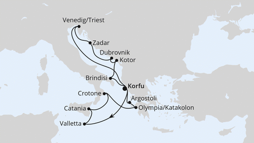 An der Grenzlinie zwischen Griechenland und Albanien erhebt sich die griechische Insel Korfu aus den Wellen des östlichen Mittelmeers. Bereits vom Schiff aus erkennen Sie, dass sich auf Korfu eine traumhafte Landschaft und ein buntes Stadtleben zu einem faszinierenden Gesamtbild zusammenfügen. Die Landausflüge, die bei einer Kreuzfahrt möglich sind, bieten eine besondere Abwechslung. Hier flanieren Sie unter Olivenbäumen entlang, probieren von den süßen Früchten auf dem Markt und lernen mehr über die Geschichte der Stadt. Da ist es kaum verwunderlich, dass Korfu zu den schönsten Inseln Griechenland zählt.