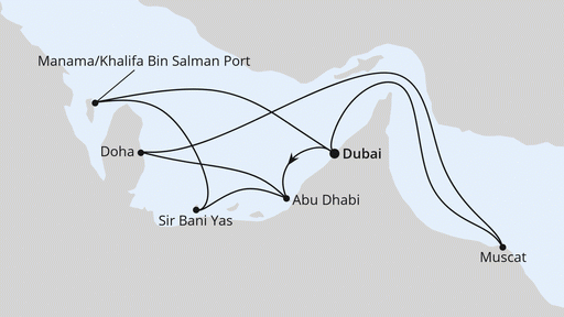 Dubai ist die größte Stadt innerhalb der Vereinigten Arabischen Emirate, zu denen auch Abu Dhabi, Adschman, Fudschaira, Ra’s al-Chaima, Schardscha und Umm al-Qaiwain zählen. Dabei ist Dubai beeindruckend anders. Vielseitig und temperamentvoll verbindet die Hauptstadt des Emirates mit über 2 Millionen Einwohnern den modernen urbanen Lebensstil mit Tradition und Geschichte. Das Emirat ist zu jeder Jahreszeit eine Kreuzfahrt wert.